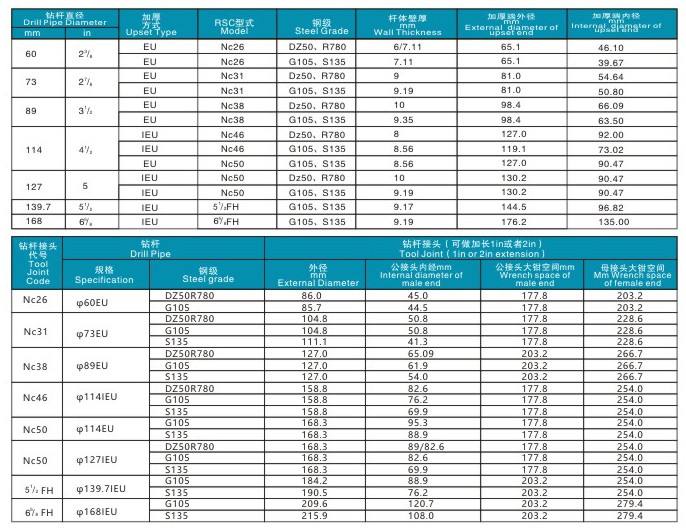 摩擦焊鉆桿及接頭執(zhí)行API / SPEC/5DP和 SY/T5561-2008標(biāo)準,鉆桿現(xiàn)有DZ50、R780、 G105、S135鋼級,均經(jīng)過局部或整體熱處理, 機械性能滿足標(biāo)準要求;接頭采用優(yōu)良的合金鋼35CrM。、4137H等調(diào)質(zhì)處理,螺紋由數(shù)控車床、成型刀具加工,表面鍍銅或磷化處理,防粘扣性能良好。也可根據(jù)客戶要求定制生產(chǎn)。